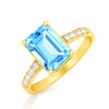 Wyjątkowy złoty pierścionek wysadzany topazem i diamentami. Wykonany z największą starannością ze złota wysokiej próby 585. Prostokątny niebieski kamień topaz w towarzystwie diamentów na szynie przepięknie połyskuje w świetle. Pierścionek doskonale sprawdzi się na wyjątkowe okazje, jak również na co dzień!