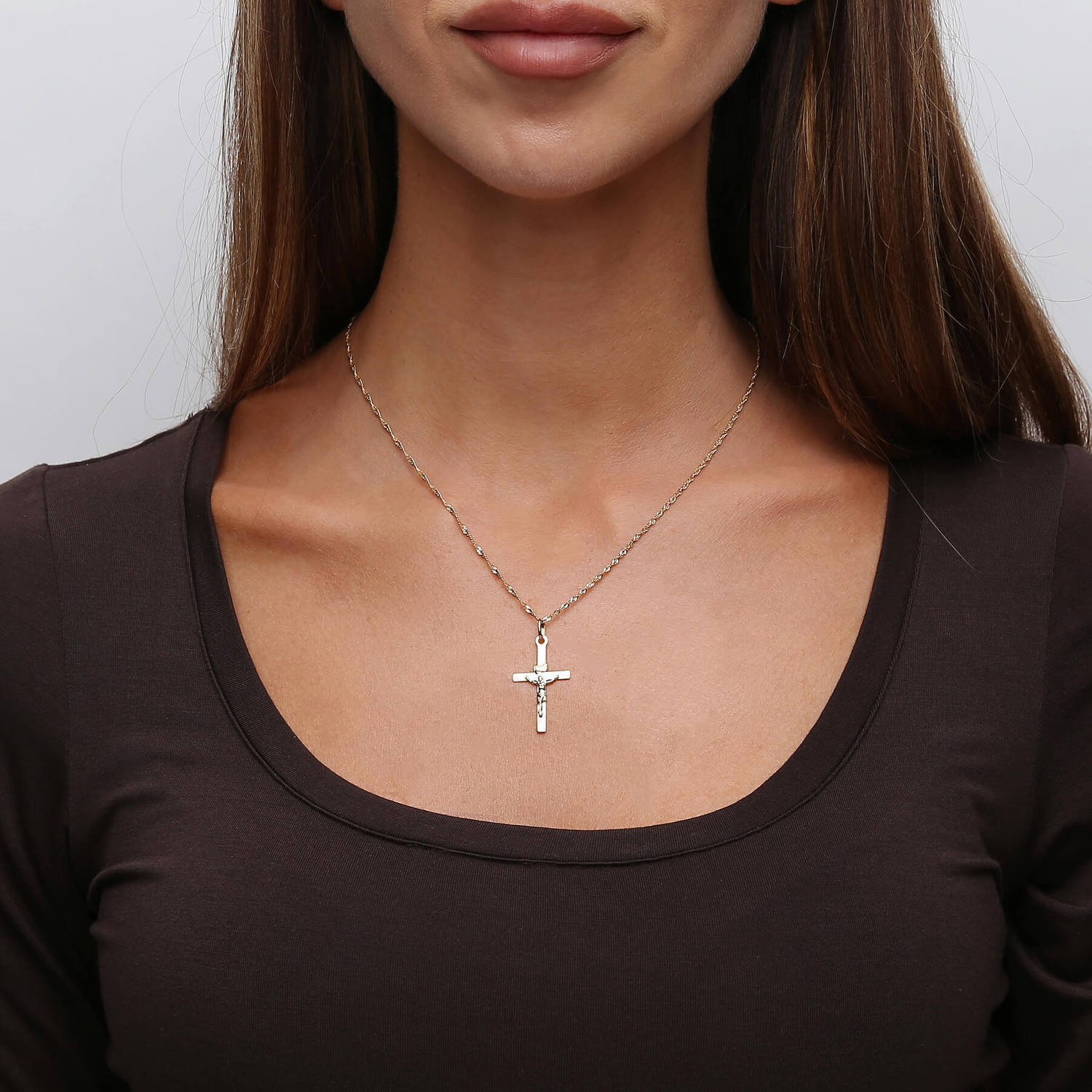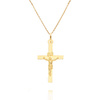 Złota zawieszka z Jezusem Chrystusem na krzyżu. Wykonana z wysokiej jakości złota o próbie 585. Sakralna biżuteria jest idealnym prezentem na takie okazje jak Chrzest Święty, Pierwsza Komunia Święta czy Bierzmowanie.