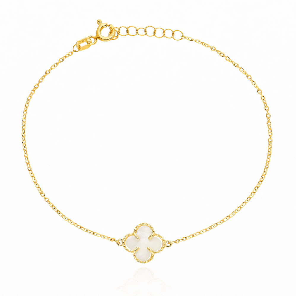 Subtelna bransoletka z zawieszką w kształcie koniczynki z białym kamieniem - masą perłową naturalną. Bransoletka na diamentowanym łańcuszku typu ankier. Wykonana ze złota wysokiej próby 585 (14-karatowe). Śliczny dodatek do wielu stylizacji. Pięknie prezentuje się na nadgarstku solo, jak również kaskadowo w towarzystwie innych bransoletek.