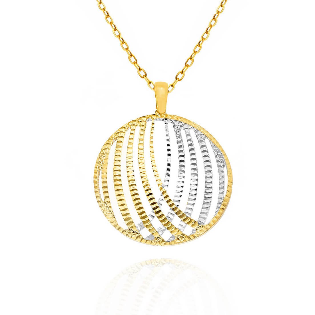 Elegancka zawieszka z motywem ażurowego koła. Wykonana z żółtego i białego złota wysokiej próby 585 (14 k). Diamentowanie sprawia, że zawieszka pięknie mieni się w świetle. Idealny podarunek na wiele okazji. Zawieszka występuje w komplecie z kolczykami.