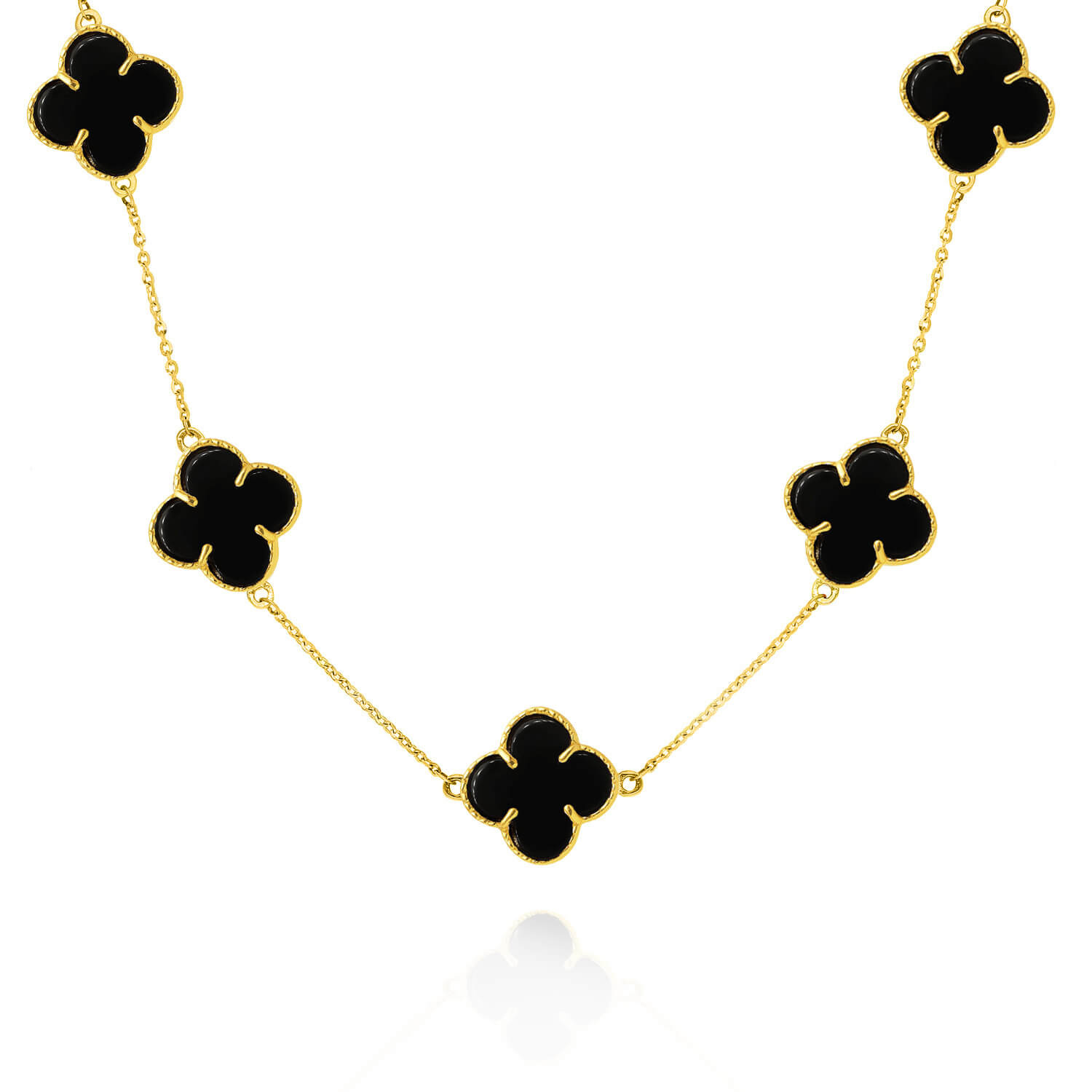 Naszyjnik ręcznie wykonany ze złota próby 585 (14-karatów) z kamieniami naturalnymi w kształcie koniczynek. Symbol czterolistnej koniczynki przypomina o czterech nadrzędnych wartościach: szczęściu, zdrowiu, miłości oraz bogactwu. Kamienie czarnego onyksu cudownie połyskują w dziennym świetle. Naszyjnik spodoba się kobietom, które cenią oryginalność i niepowtarzalność.