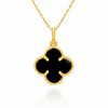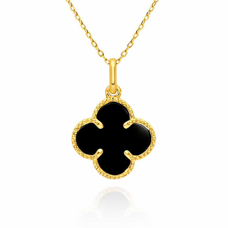 • Wyjątkowa złota zawieszka w kształcie koniczynki wypełnionej onyksem. Wykonana z żółtego złota wysokiej próby 585 (14-karatowego)