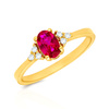 • Złoty pierścionek z owalnym, różowym kamieniem centralnym i białymi cyrkoniami po bokach. Elegancki, klasyczny design.