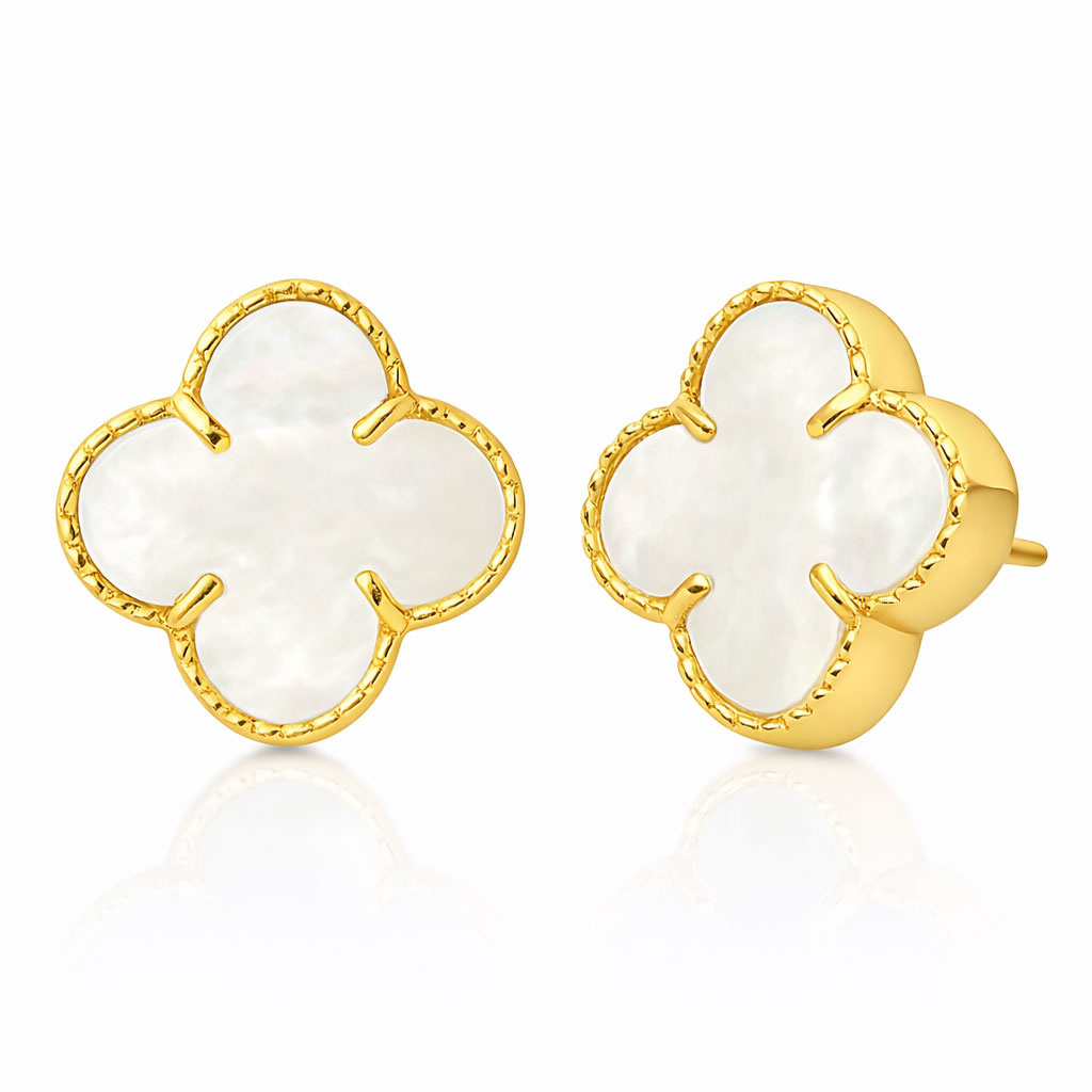Złote kolczyki koniczynki z masą perłową i diamentowaną oprawą ze złota próby 585 (14-karatowego), to połączenie elegancji, nowoczesności i subtelnego Diamentowanie, czyli precyzyjny szlif na powierzchni złota, nadaje biżuterii dodatkowego połysku, który przyciąga wzrok i odbija światło. Będą doskonałym wyborem na różnorodne okazje – od codziennych stylizacji po eleganckie wyjścia.