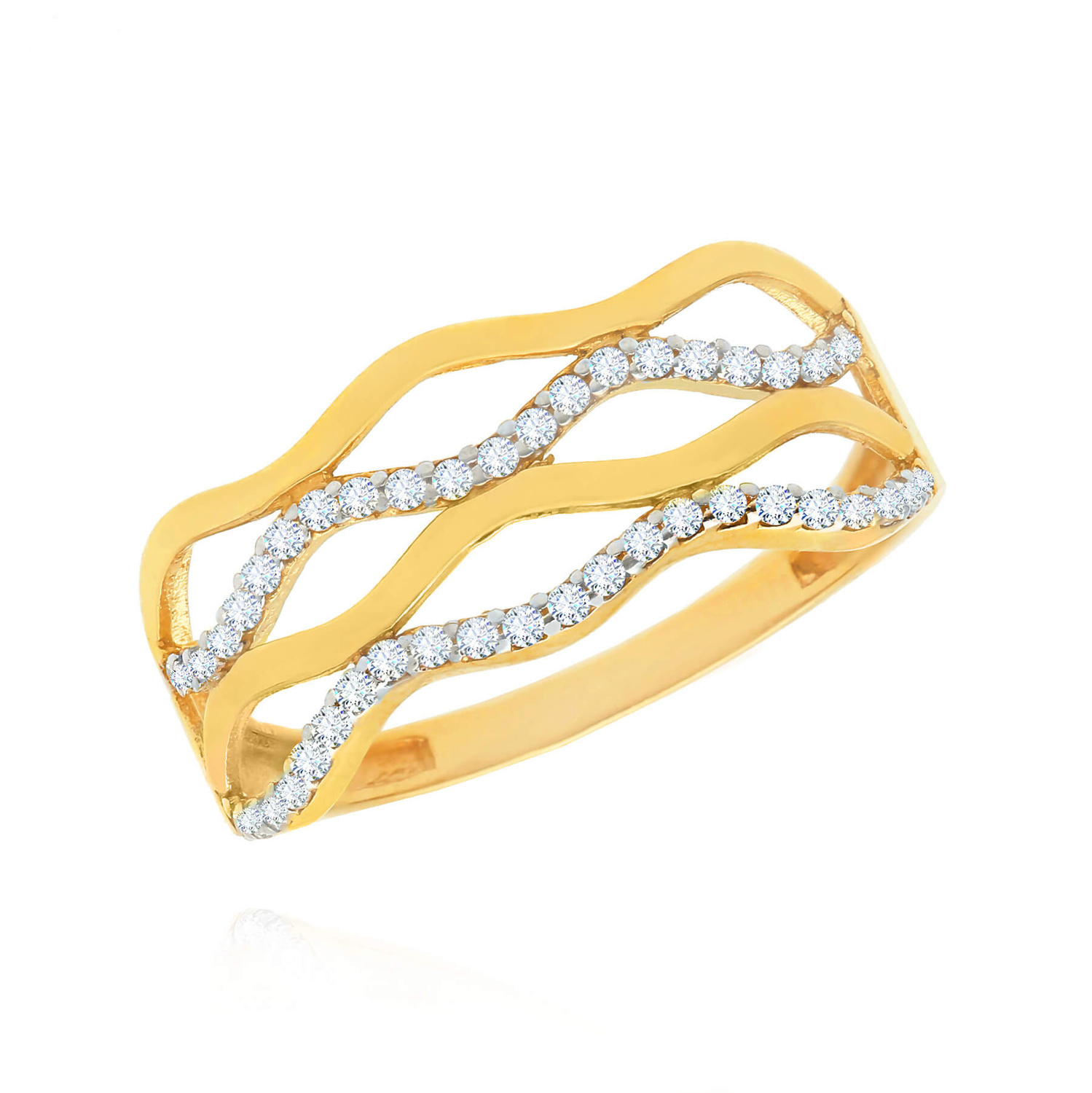 • Nowoczesny pierścionek z falującym wzorem, wykonany ze złota próby 585 (14-karatowego), ozdobiony dwoma rzędami lśniących białych cyrkonii.