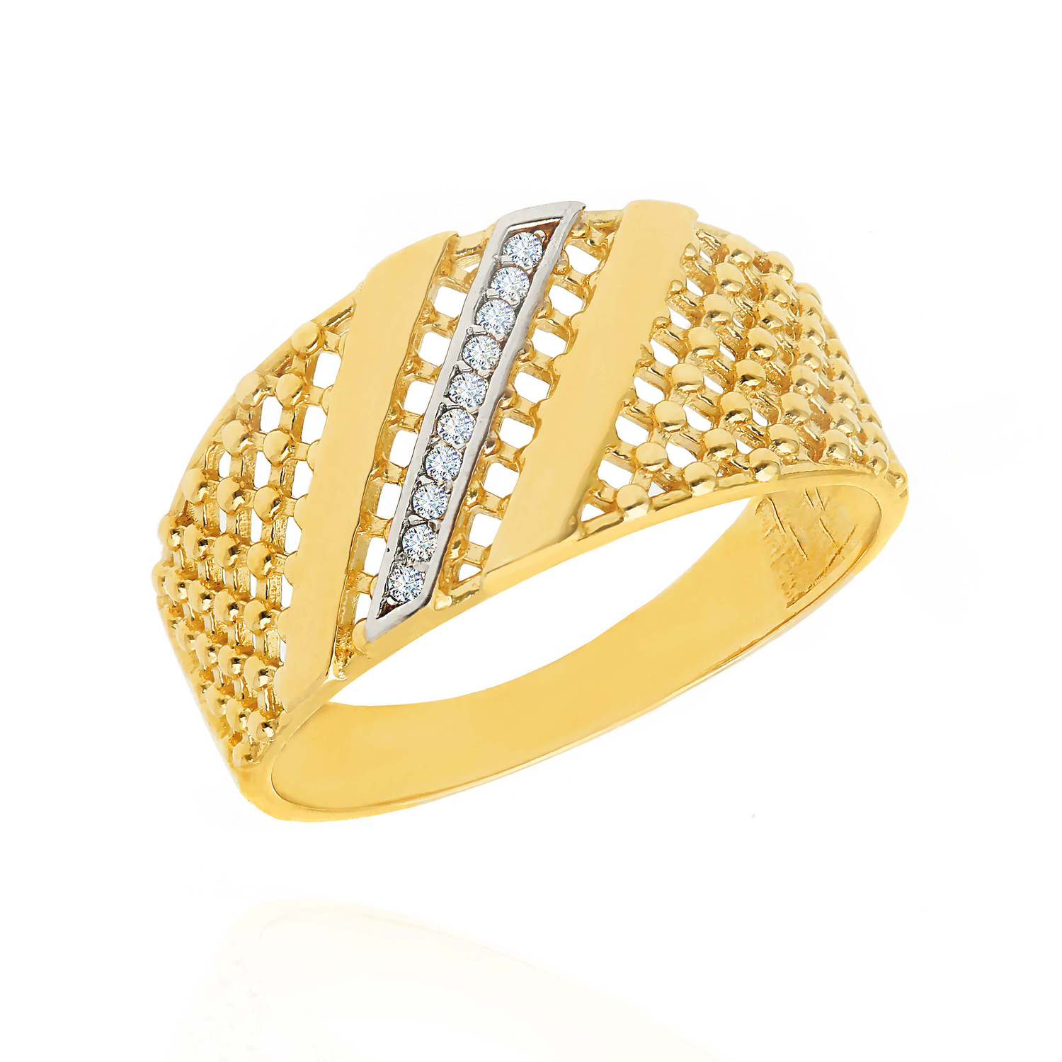 Nowoczesny pierścionek z ażurowym wzorem, wykonany z białego i żółtego złota próby 585 (14-karatowego), ozdobiony rzędem lśniących białych cyrkonii. Elegancki design, który przyciąga wzrok i podkreśla styl. Doskonale układa się na palcu, tworząc wyrazisty akcent w każdej stylizacji.