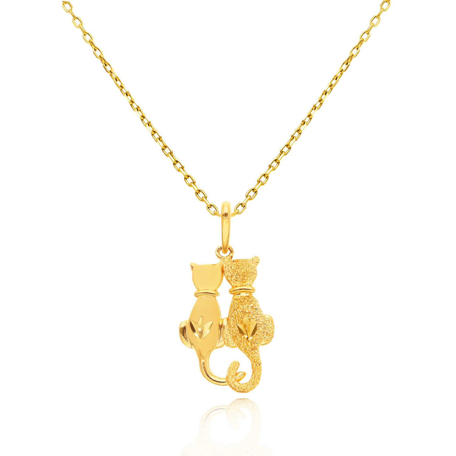 Złota zawieszka z motywem pary kotków, symbol miłości i przyjaźni. Wykonana ręcznie z najwyższą starannością z żółtego złota próby 585 (14-karatowego). Tworzy wspaniały komplet z łańcuszkiem o splocie lisi ogon, singapur.