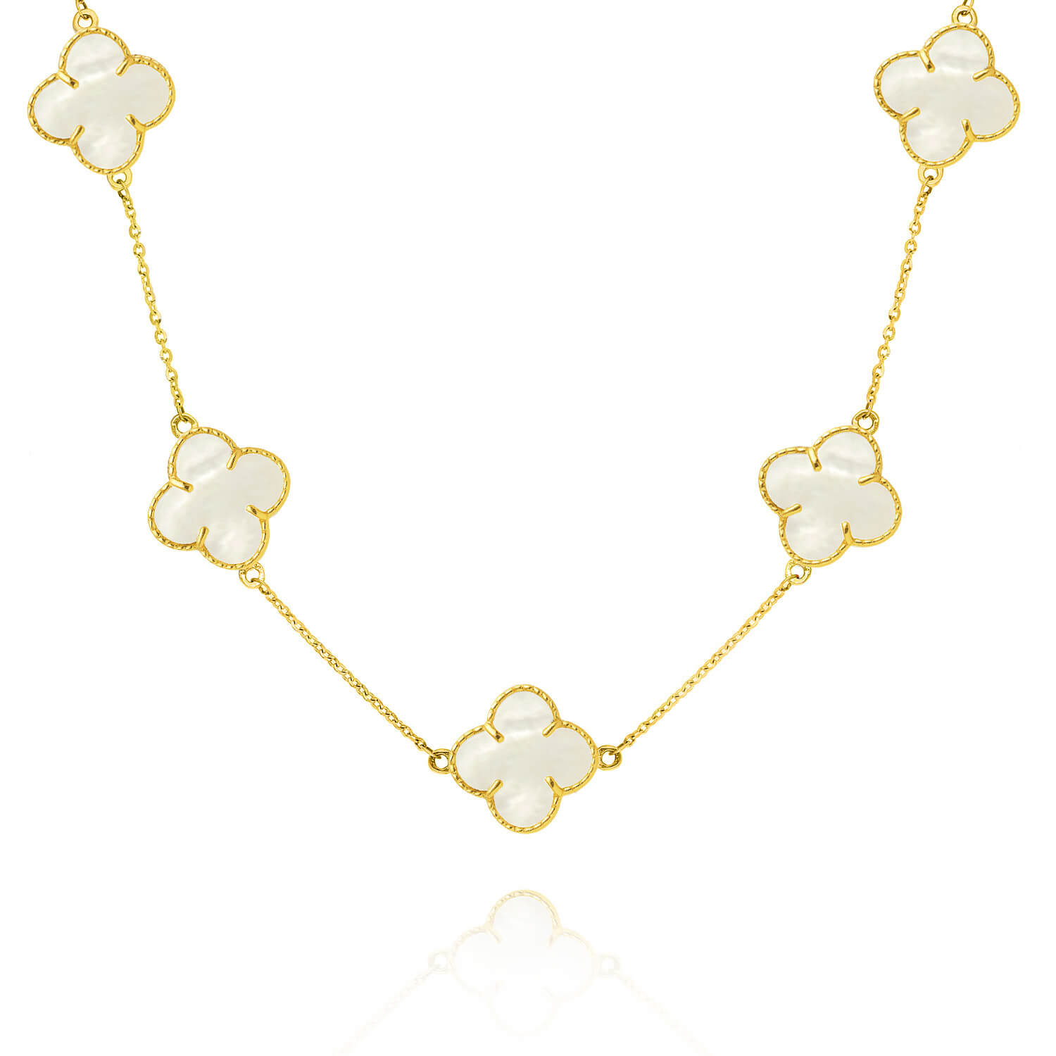 Naszyjnik ręcznie wykonany ze złota próby 585 (14-karatów) z kamieniami naturalnymi w kształcie koniczynek. Symbol czterolistnej koniczynki przypomina o czterech nadrzędnych wartościach: szczęściu, zdrowiu, miłości oraz bogactwu. Masa perłowa cudownie połyskuje w dziennym świetle. Naszyjnik spodoba się kobietom, które cenią oryginalność i niepowtarzalność.