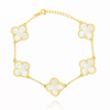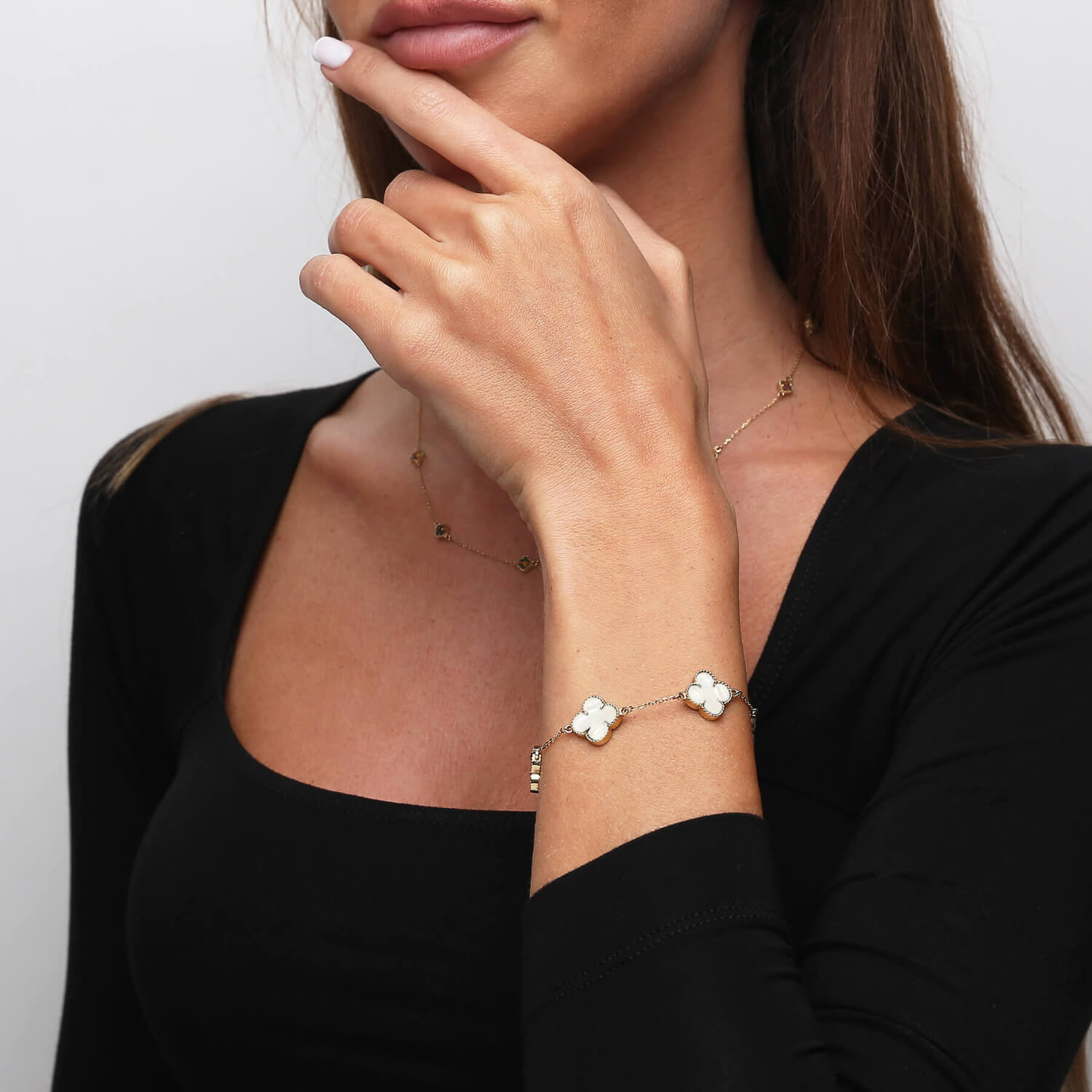 Bransoletka ręcznie wykonana ze złota próby 585 (14-karatów) z kamieniami naturalnymi w kształcie koniczynek. Symbol czterolistnej koniczynki przypomina o czterech nadrzędnych wartościach: szczęściu, zdrowiu, miłości oraz bogactwu. Masa perłowa cudownie połyskuje w dziennym świetle. Bransoletka spodoba się kobietom, które cenią oryginalność i niepowtarzalność.