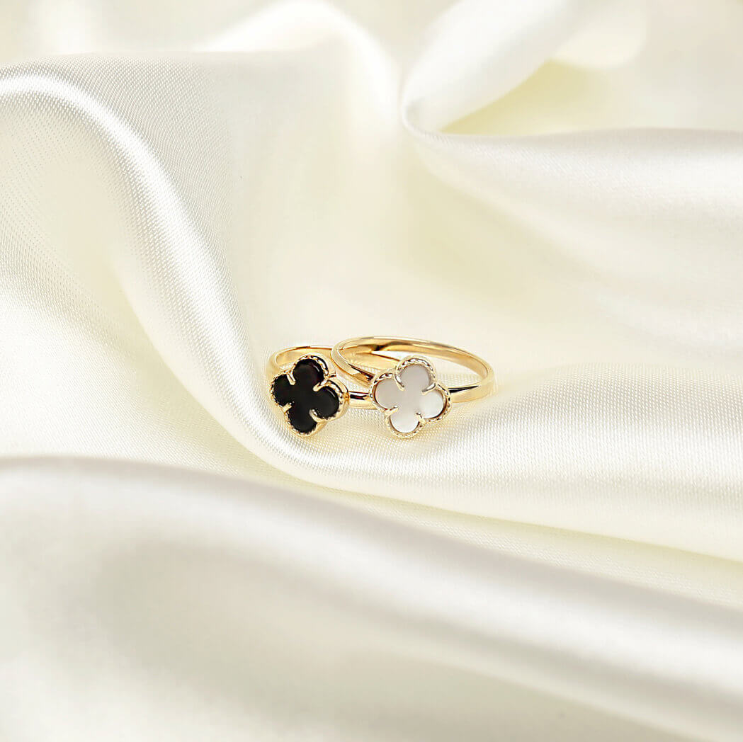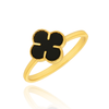 • Subtelny pierścionek w formie koniczynki z czarnym onyksem. Wykonany ze złota próby 585 (14-karatowego).