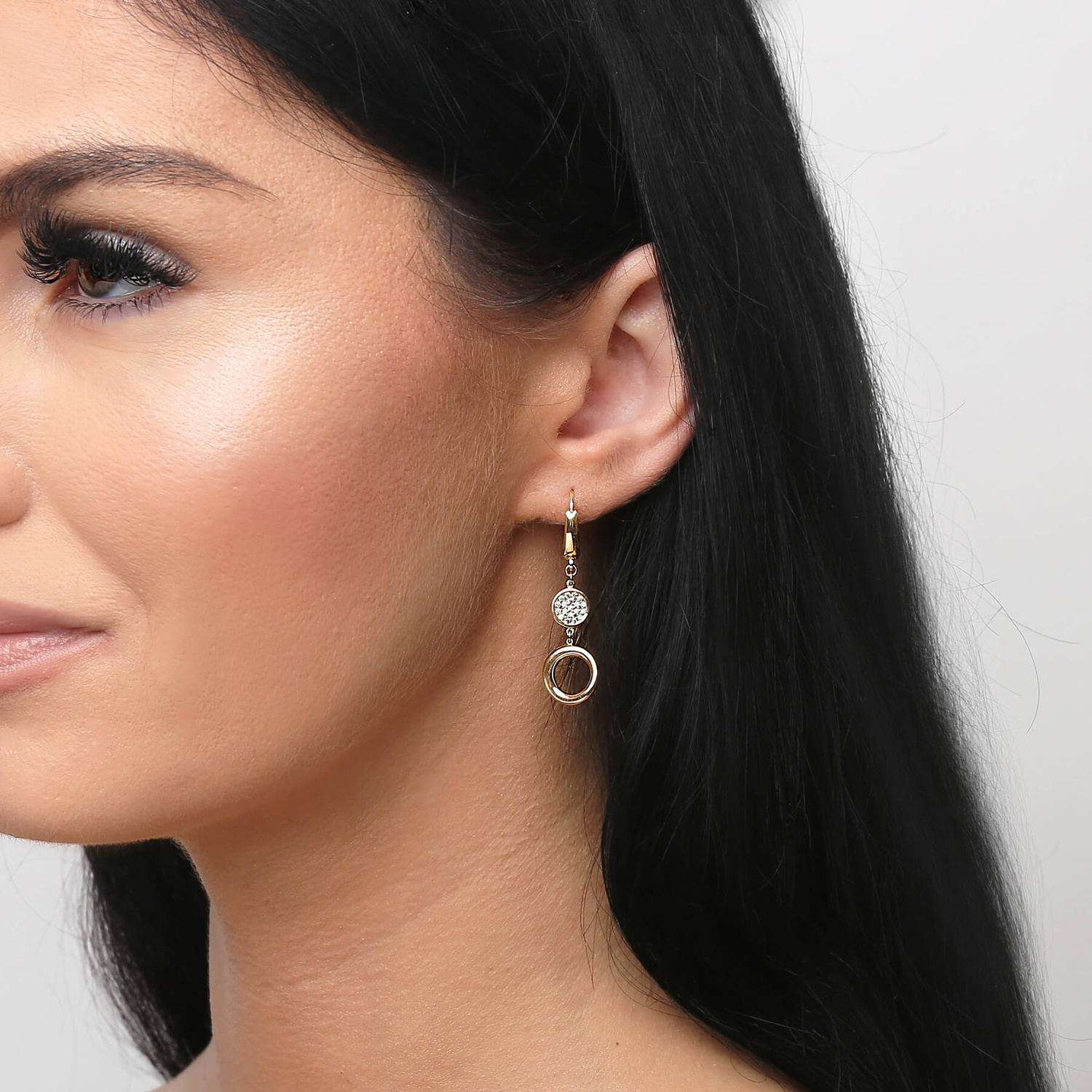 Złote kolczyki wykonane ze złota próby 585 (14-karatowego). Podwójne koła zdobione cyrkoniami, to elegancki dodatek dla kobiet ceniących elegancję i nowoczesne wzornictwo. Kolczyki składają się z dwóch połączonych elementów – górnej okrągłej części, wysadzanej cyrkoniami, które pięknie odbijają światło, oraz dolnego, gładkiego koła o wysokim połysku, nadającego całości lekkości i elegancji. Kolczyki posiadają wygodne zapięcie angielskie, które zapewnia bezpieczeństwo i komfort noszenia. To biżuteria, która subtelnie podkreśli urodę, dodając blasku zarówno codziennym, jak i wieczorowym stylizacjom. Kolczyki występują w komplecie z naszyjnikiem.