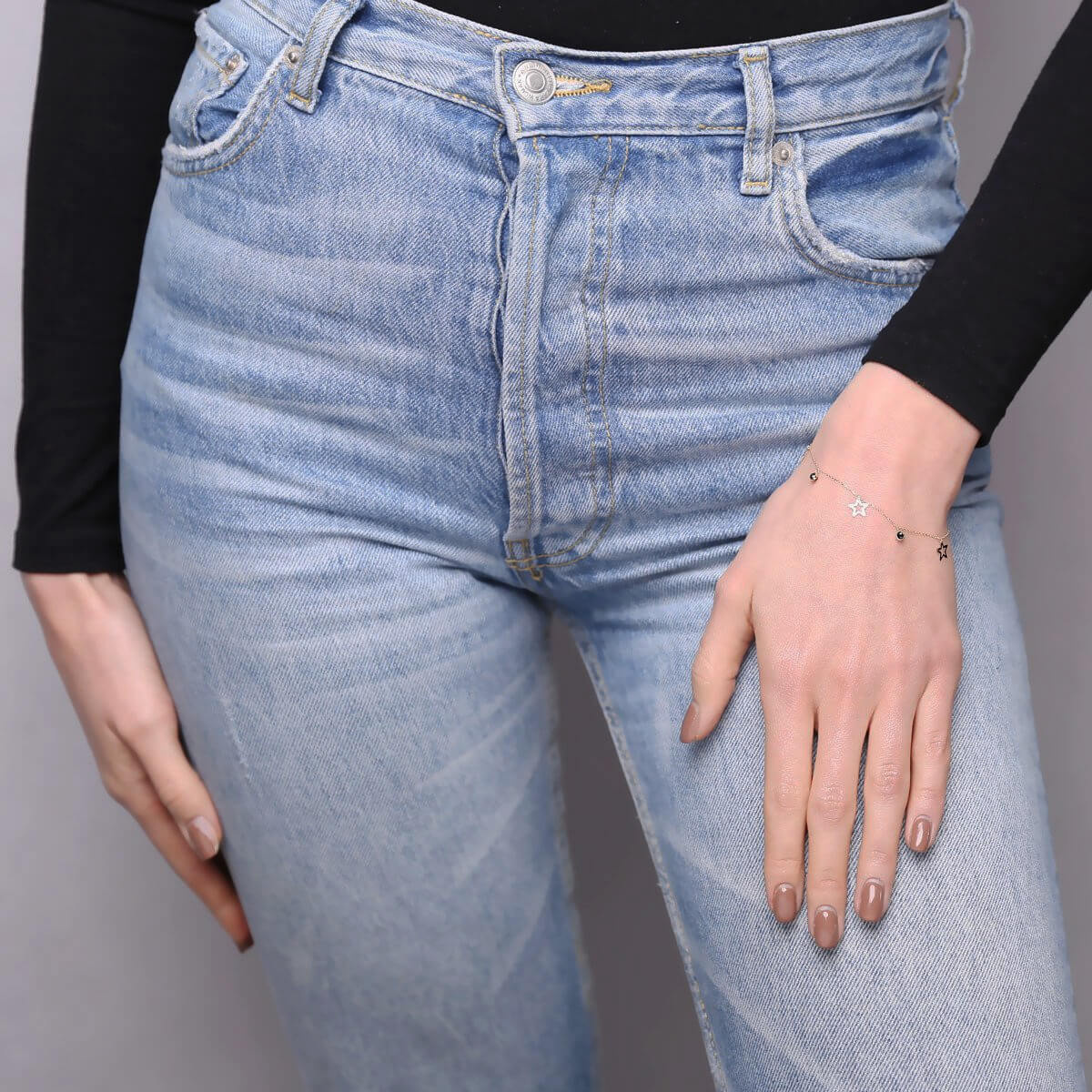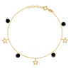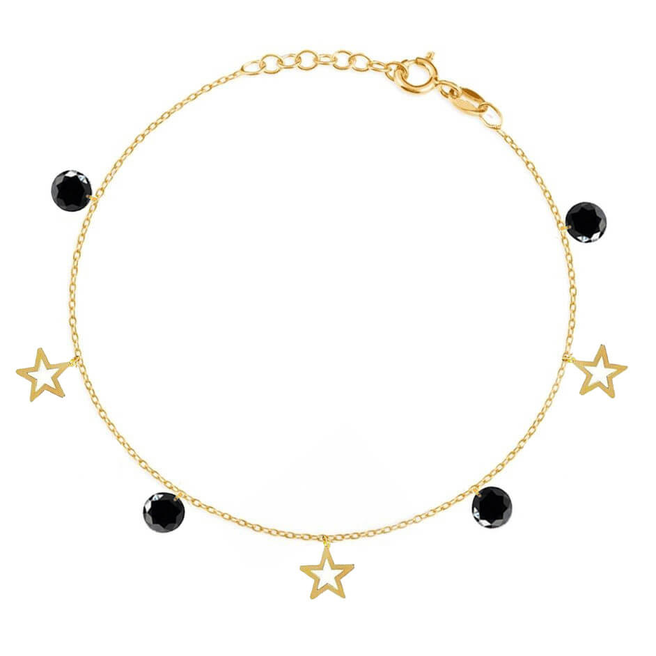 Bransoletka wykonana z żółtego złota wysokiej próby 585 (14 karatów). To gwarancja trwałości biżuterii i jej wiecznej złotej barwy. Łańcuszek o splocie ankier wykończony jest zawieszkami w kształcie gwiazdek i pojedynczych, czarnych cyrkonii.