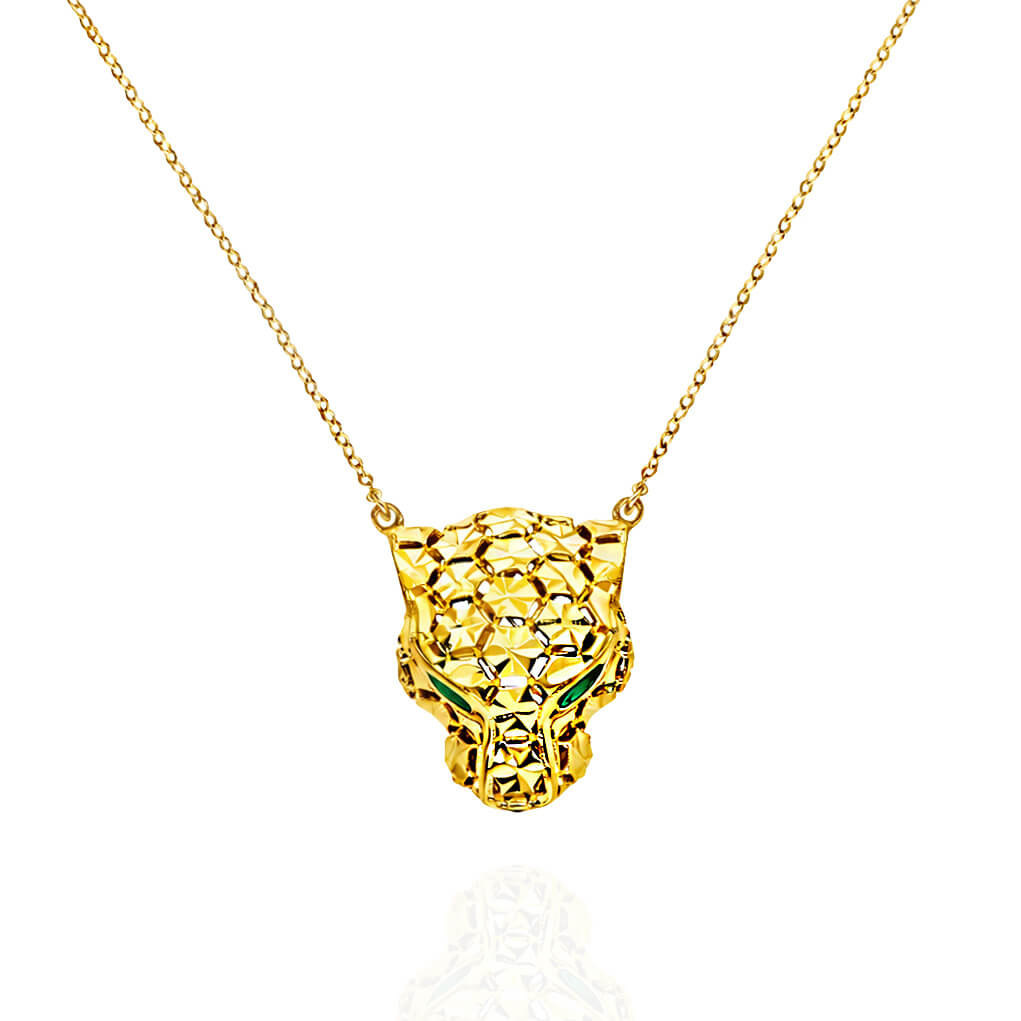 Złoty naszyjnik damski na diamentowanym łańcuszku ankier z motywem tygrysa z zielonymi oczami. Luksusowa biżuteria na prawdziwie wyjątkowe okazje. Doskonale zwieńczy niejedną stylizacje. Ręczne wykonanie i wysoka próba złota 585 zapewnia trwałość i niezmienność barwy.