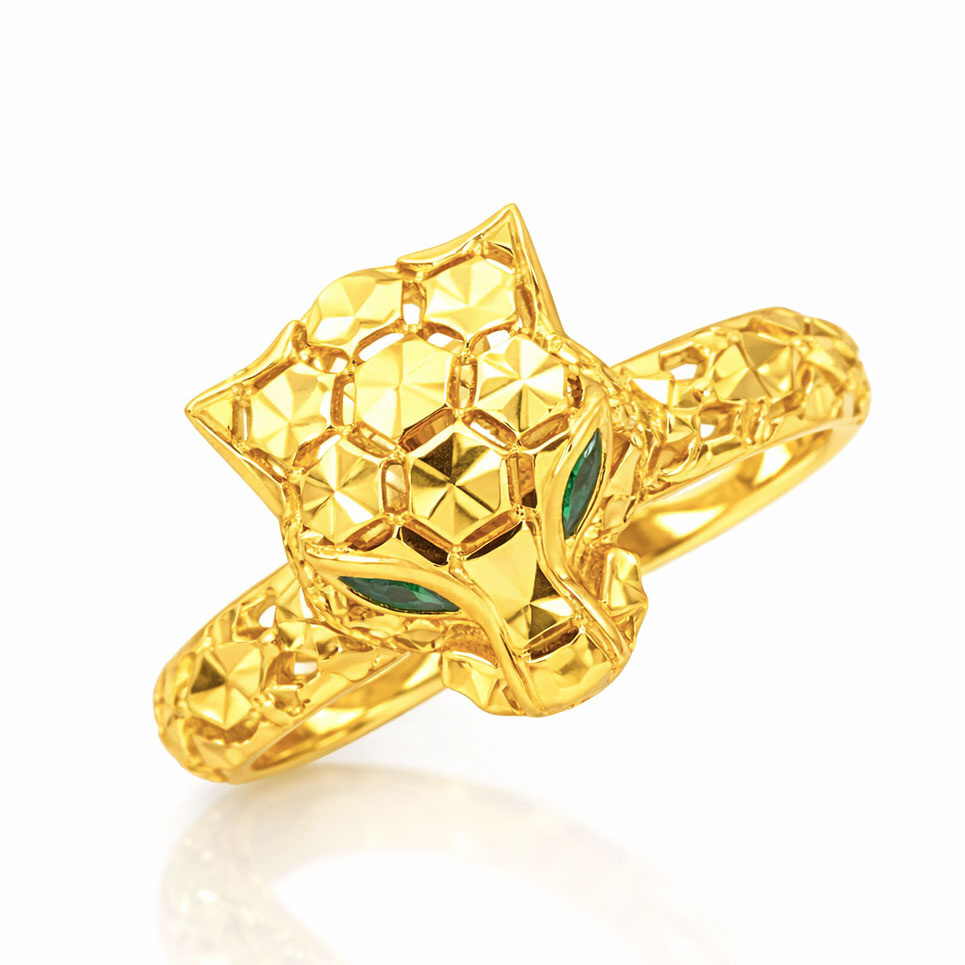 Efektowny pierścionek wykonany z żółtego złota próby 585 (14-karatowego), zachwycający oryginalnym wzorem tygrysa i starannym wykończeniem. Centralnym elementem jest głowa tygrysa, ozdobiona geometrycznymi, fasetowanymi powierzchniami, które pięknie odbijają światło i podkreślają kolor złota. Oczy akcentowane są zielonymi detalami, nadającymi biżuterii wyrazisty, luksusowy charakter. Ażurowa obrączka z dekoracyjnymi wycięciami sprawia, że pierścionek prezentuje się lekko, a jednocześnie bardzo solidnie i elegancko. Wyjątkowa propozycja dla osób ceniących odważną biżuterię.