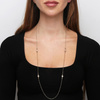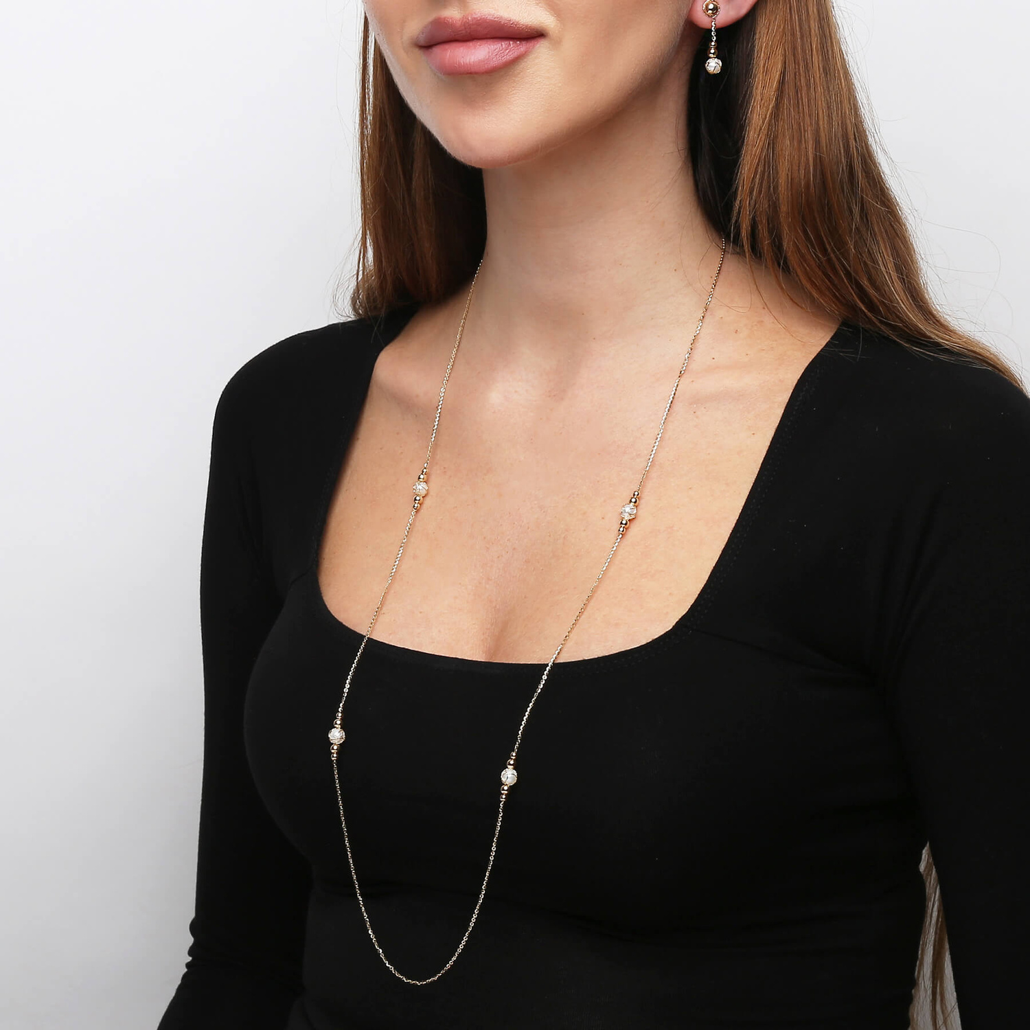 Długi naszyjnik na diamentowanym łańcuszku ankier z regularnie rozmieszczonymi kuleczkami oraz perełkami, które nadają mu lekkości i wyrafinowanego charakteru. Długość naszyjnika pozwala nosić go swobodnie, pięknie układając się na dekolcie i optycznie wydłużając sylwetkę. Doskonale sprawdzi się jako eleganckie uzupełnienie wieczorowych kreacji. Świetnie komponuje się z gładkimi sukienkami oraz bluzkami z głębokim dekoltem. Naszyjnik występuje w komplecie z kolczykami.