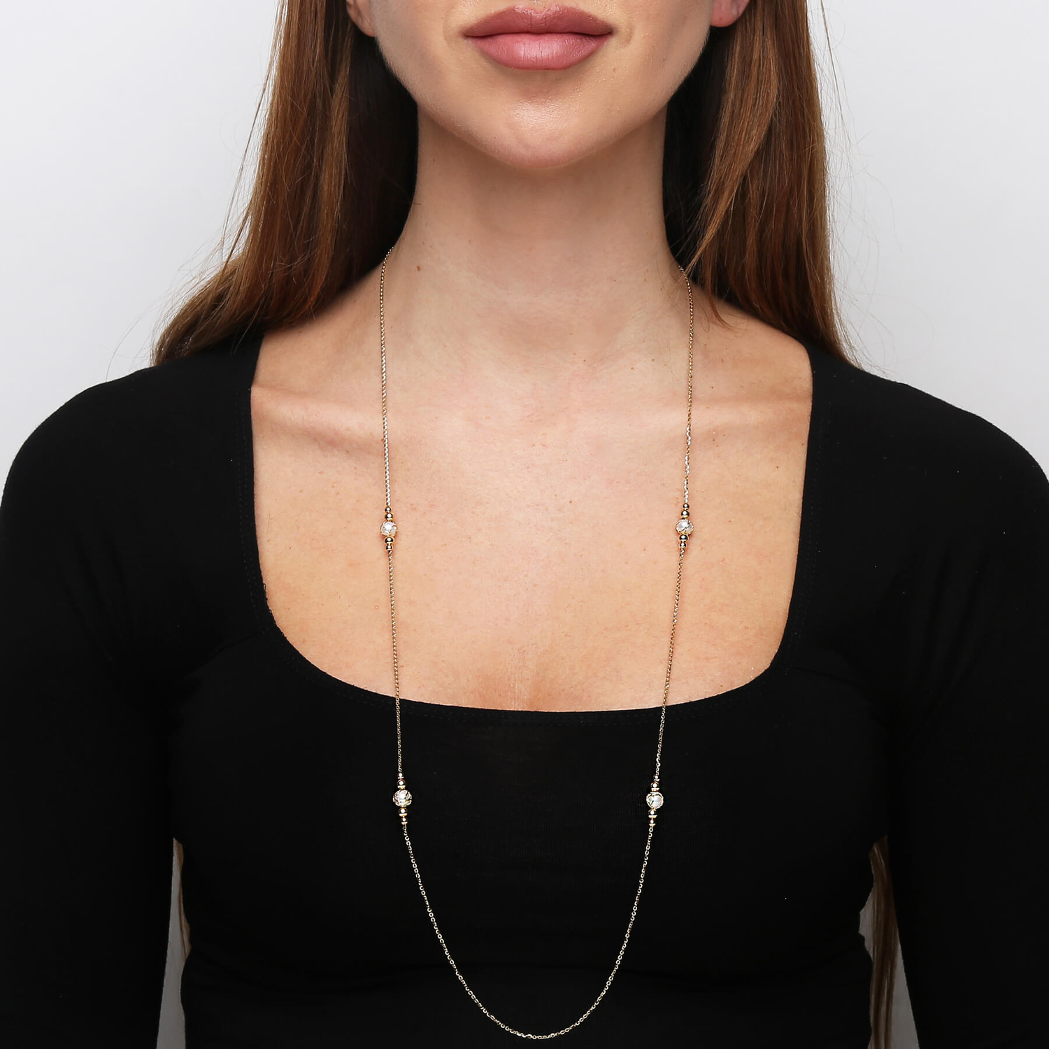 • Długi naszyjnik na diamentowanym łańcuszku ankier z kuleczkami oraz perełkami. Wykonany ze złota próby 585 (14-karatowego).