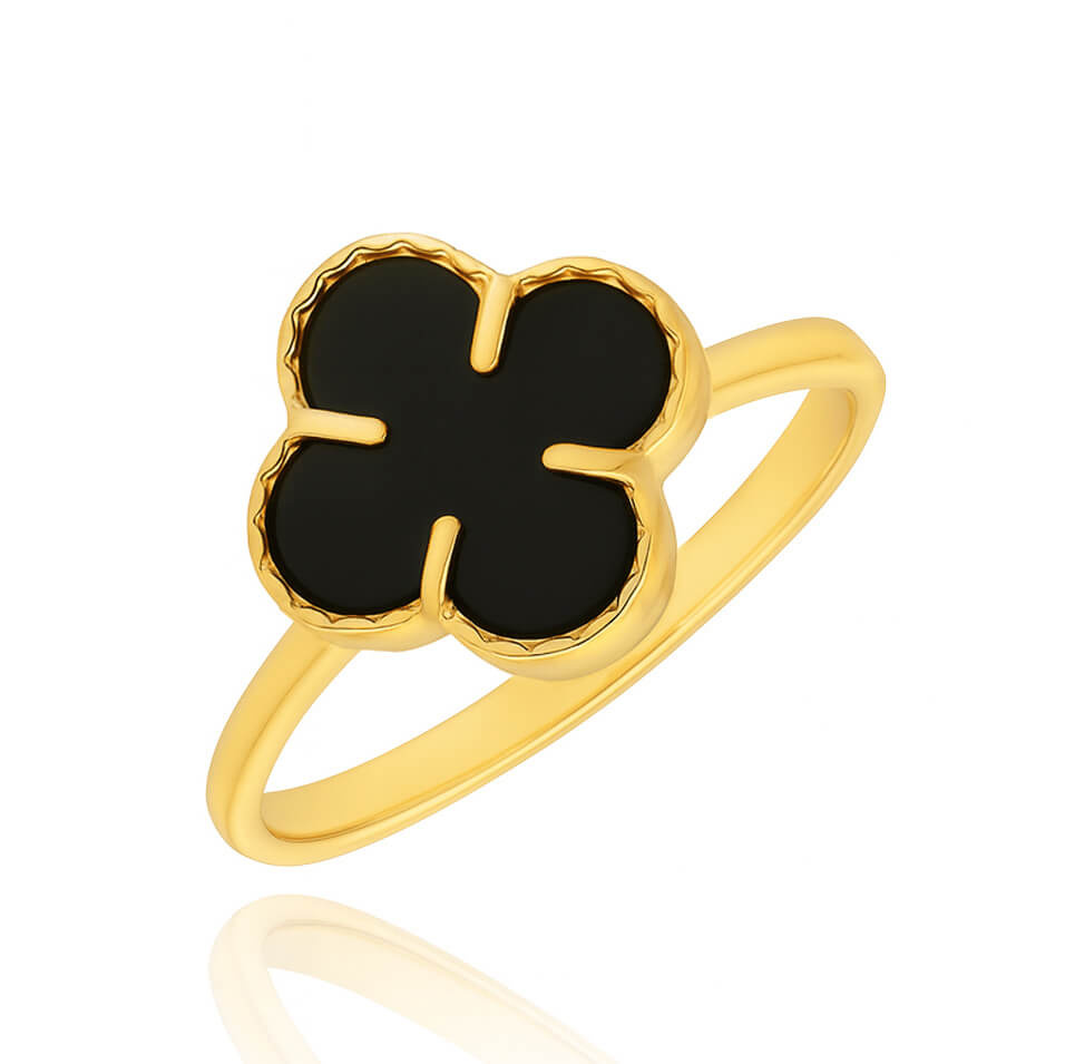 • Wyjątkowy pierścionek w formie dużej koniczynki z czarnym onyksem. Wykonany ze złota próby 585 (14-karatowego).