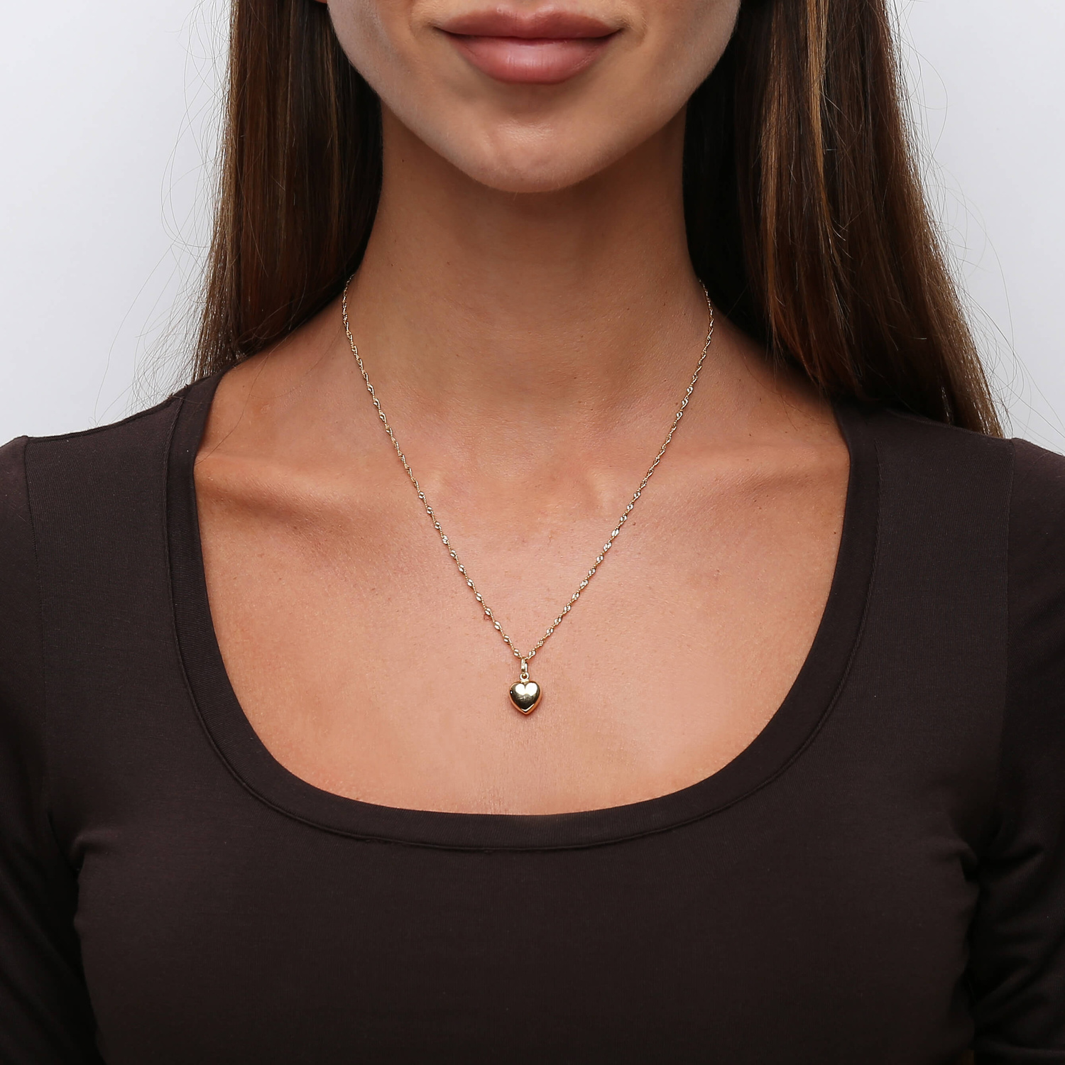 Elegancki wisiorek zawieszka do łańcuszka z motywem serca. Wykonana ręcznie ze złota wysokiej próby 585. Wypukły kształt sprawia, że przepięknie mieni się w świetle padającym pod różnym kątem. Zachwyca swoją prostotą i starannością wykonania. Wisiorek tworzy wspaniały komplet z łańcuszkiem o splocie lisi ogon, singapur, ankier lub korda. Modelka ma na sobie zestaw z łańcuszkiem singapur 45 cm.